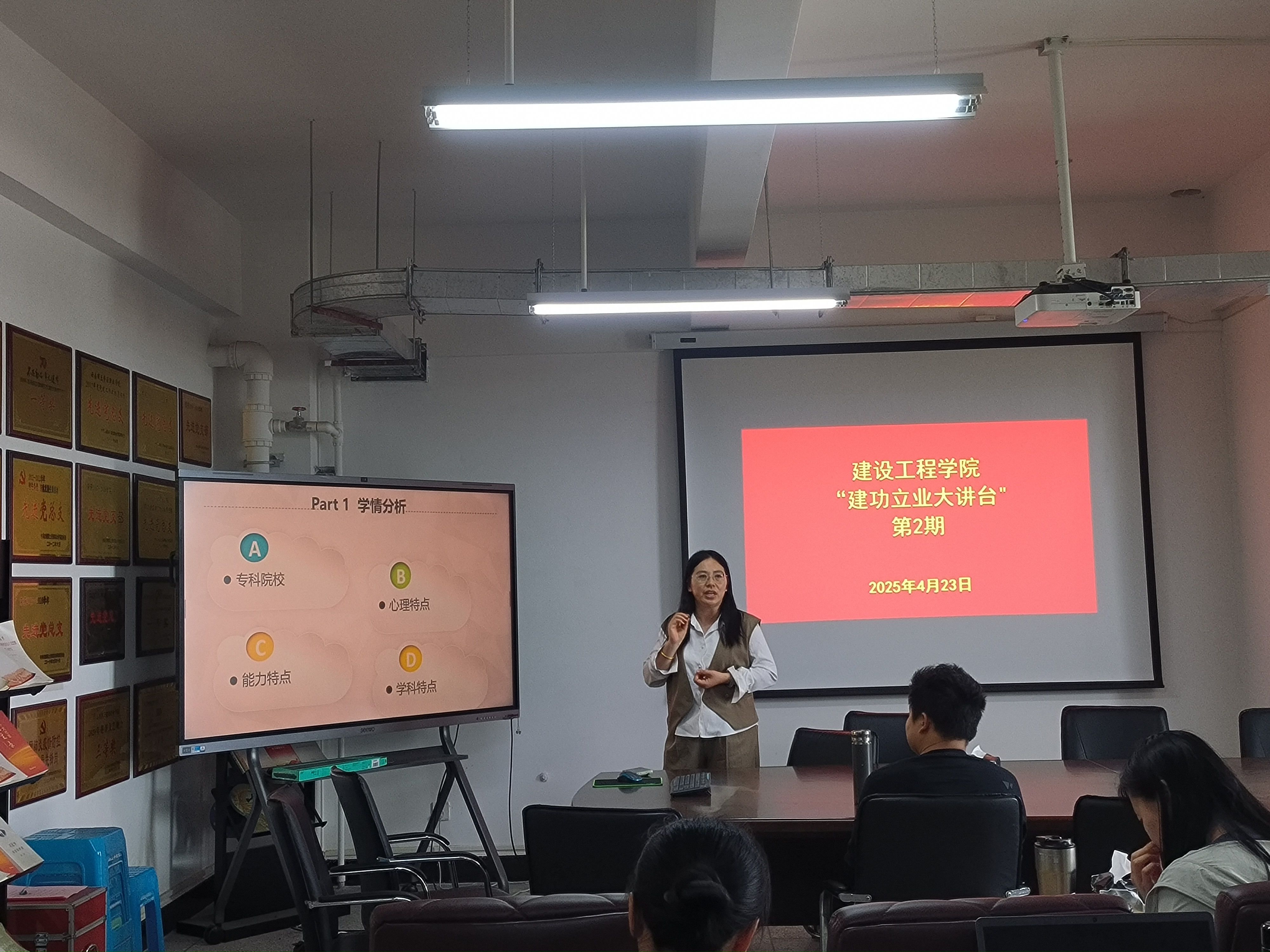 会议最后,学院举办了“建功立业大讲台”第二期交流分享活动,温天红和靳凯两位老师分别分享了高分课堂教学经验与方法,旨在促进教师团队相互学习,共同提升教学质量。