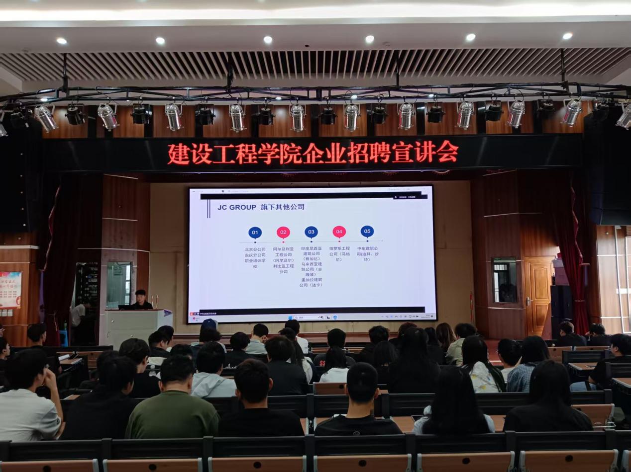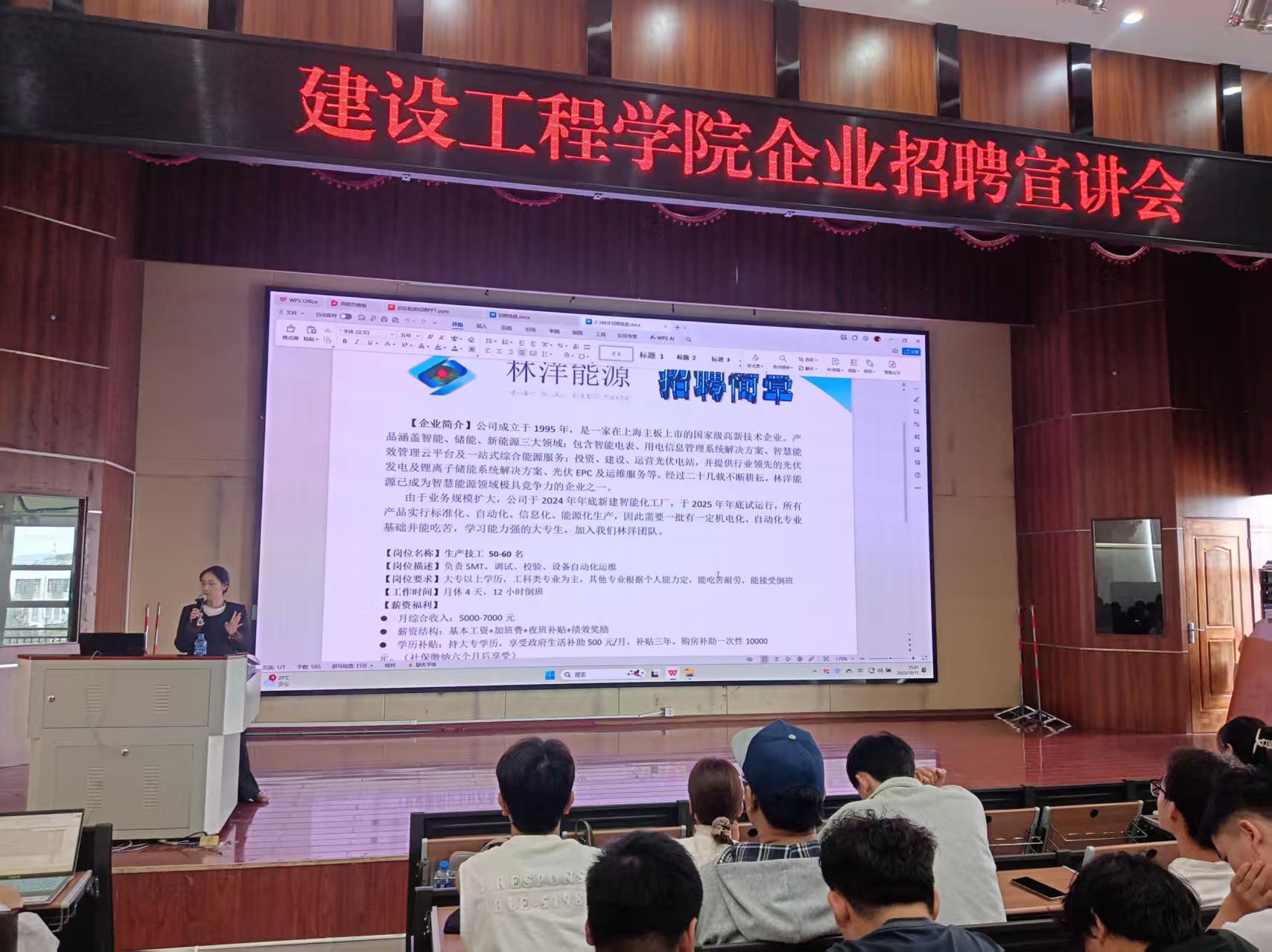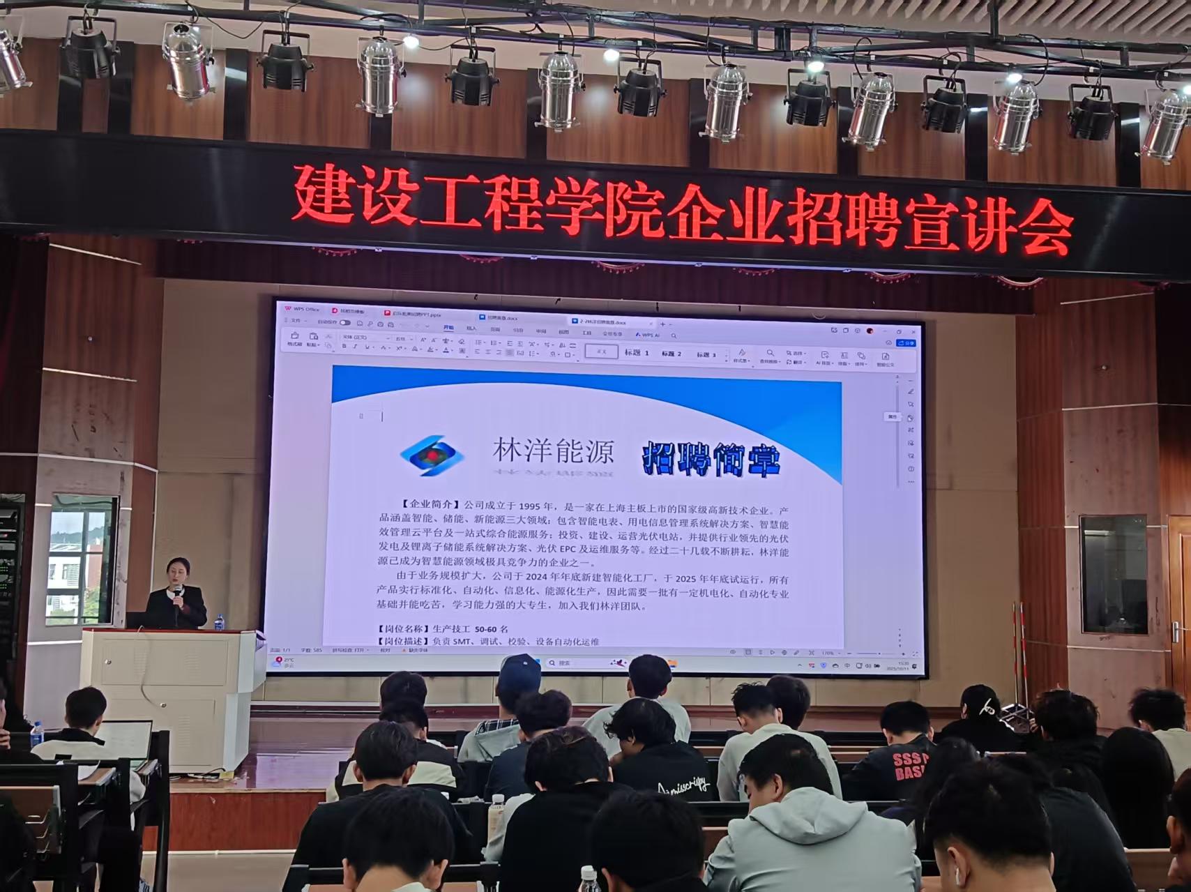 宣讲会上,各企业代表通过宣传片展播、PPT讲解、现场问答等形式,系统介绍了行业发展趋势、企业文化及人才需求。安徽中机诚建建设有限公司代表严庆伟指出,企业聚焦建筑工程领域,业务涵盖房屋建筑、市政工程、建筑装饰装修等,工程项目遍布国内外;员工实行“8小时标准工时+弹性调休”的工作时长制度;工地配备标准化食宿及休闲区,办公区位于甲级写字楼。启东乾朔电子有限公司代表董老师现场分享,企业深耕电子制造与工程服务,业务涵盖了电子元器件组装、智能设备集成等,员工执行“做五休二”制度,加班依法付加班费,工作环境以现代化车间为主,配恒温恒湿及防护设备,还设有健身房、阅览室等娱乐设施供员工休憩。林洋能源有限公司代表黄冬梅女士指出,作为新能源标杆企业,业务聚焦光伏电站建设、储能研发等,布局全国;实行“标准工时+项目制排班”工作制度,项目期外保障休息;工作环境含户外项目(配劳保与后勤)及室内开放式办公区。活动现场互动热烈,学生就实习机会、职业培训体系、晋升路径等核心问题与企业深入交流。