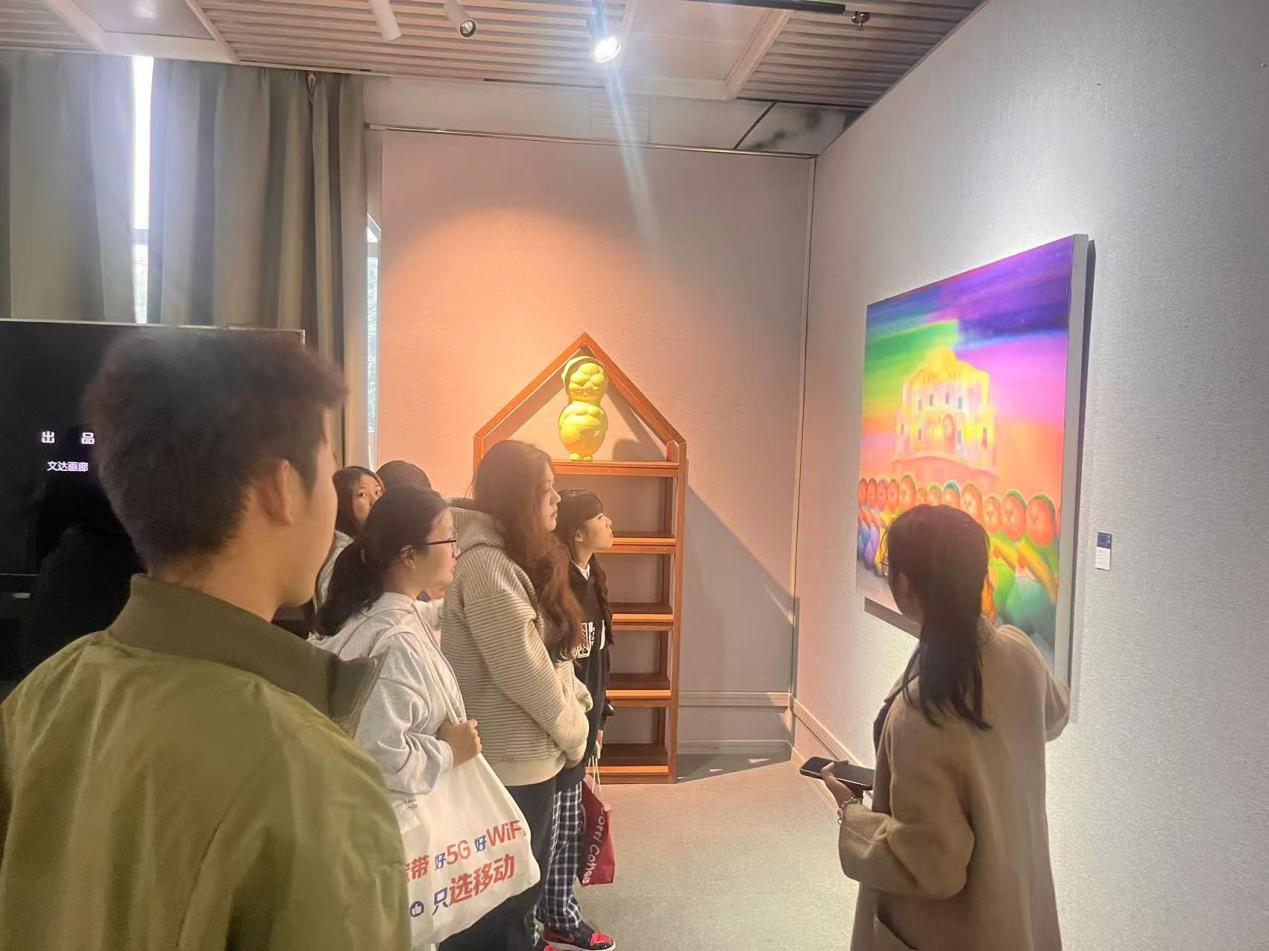 在潘德海画展现场,讲解员从创作背景、艺术手法、情感思想及艺术史意义四个维度,为学生深入解读作品。学生们围坐倾听,主动提出色彩搭配、“胖娃”寓意等疑问,现场交流氛围热烈,思想的火花在师生间不断碰撞,有利于提升学生艺术鉴赏能力。
