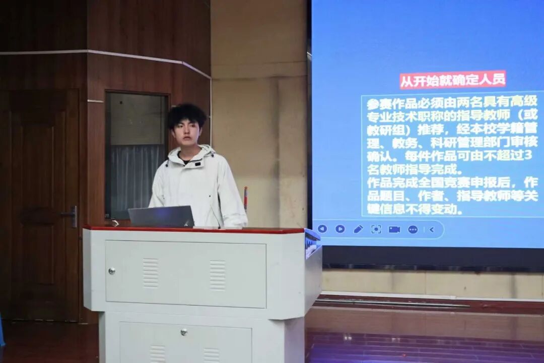 随后,他聚焦备赛核心环节,从参赛形式、报名资格、作品申报规范、申报类别划分、赛事覆盖范围等基础维度进行系统梳理,用清晰的逻辑呈现完整备赛流程;同时结合自身经历,重点圈划备赛及申报过程中的关键注意事项,细致拆解常见误区与避坑要点,为同学们提供可直接落地的实操指南。此外,张世杰还分享了大量优质参赛作品案例,通过直观展示与细节解读,帮助同学们更精准地把握赛事要求、明确创作方向。