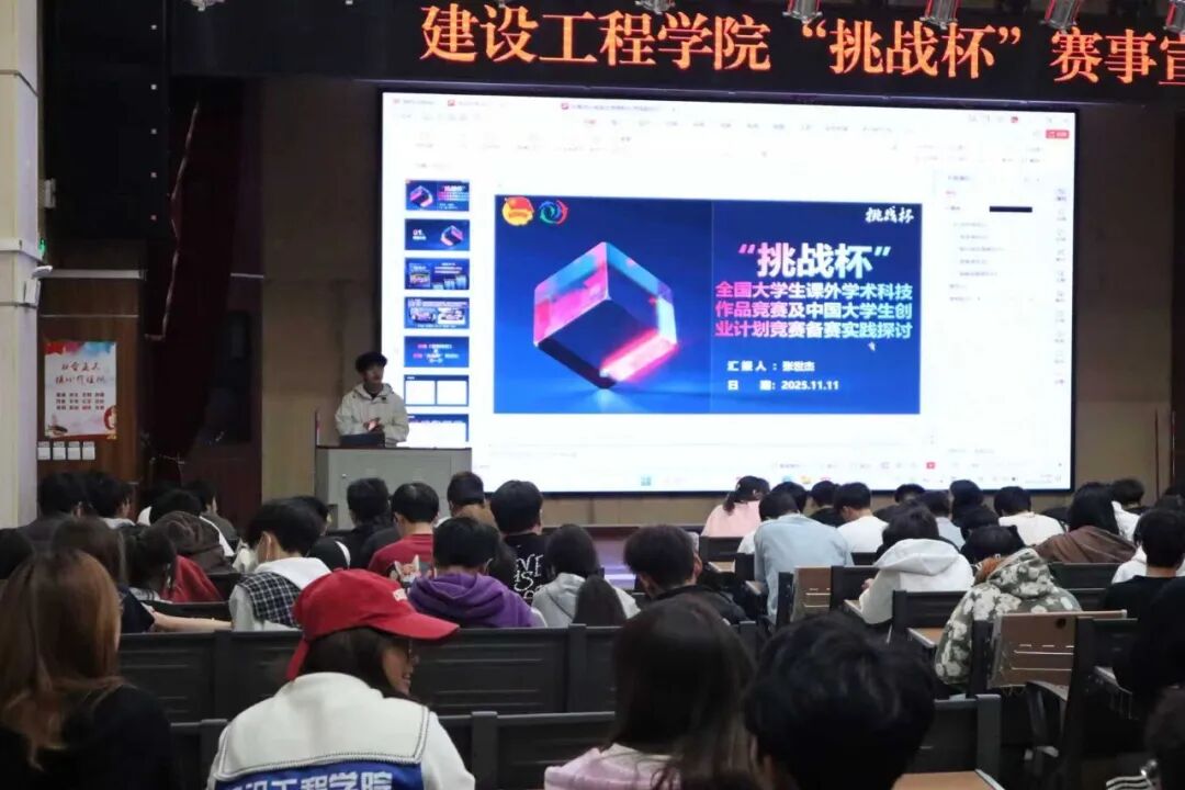 宣讲中,张世杰以“‘挑战杯’全国大学生课外学术科技作品竞赛及中国大学生创业计划竞赛备赛实践”为核心主题,展开层层递进的分享。他首先用通俗直白的语言拆解“挑战杯”的赛事内涵与核心价值,从参赛选手的视角解读赛事意义,让同学们对赛事本质形成清晰且深刻的认知。