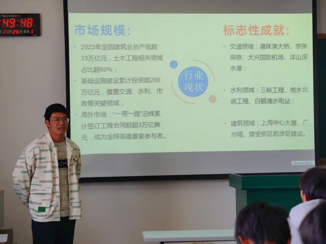 在行业现状解析环节,梁光猛以权威行业报告数据为支撑,用清晰的逻辑脉络勾勒出建设工程行业的发展全景。他告诉学弟学妹们,“与其盲目刷题,不如找准优势赛道深耕”。他结合自身专科、本科阶段的学习经验,建议同学们尽早明确专业兴趣方向,通过课程学习、技能竞赛、科研实践等多元途径夯实专业基础,构建差异化竞争优势。