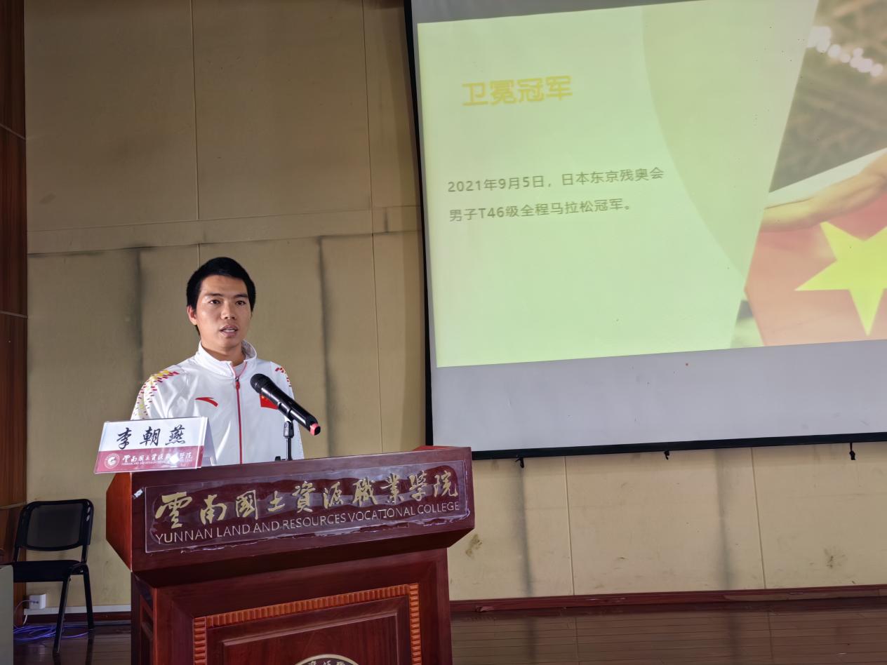 4月24日下午,澳门十大网投平台排行在光荣讲堂为学院1958黑马训练营300余名学员开展“弘扬中华体育精神,深耕爱国主义情怀”讲座。本次讲座特邀两届残奥会(2016年里约热内卢残疾人奥运会、2021年东京残疾人奥运会)马拉松项目冠军得主、云南财经大学教师李朝燕为主讲嘉宾,讲座由刘艾吉老师主持。