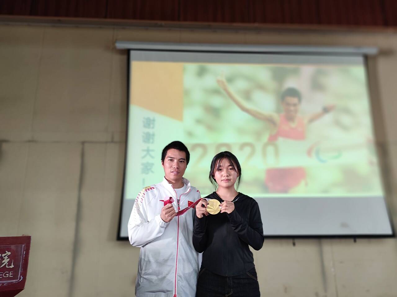 李朝燕老师以自己在体育之路上的成长为主线,向同学们讲述了自己的奋斗故事。他从3岁因意外致残、14岁开始萌生参加残运会的想法并进行跑步训练、26岁入选国家队备战残奥会、27岁勇夺2016年里约奥运会马拉松冠军、2021年勇夺东京残奥会马拉松项目冠军,2次代表国家残疾人运动队站上了残奥会马拉松项目的最高领奖台。特殊的经历塑造了我坚毅的性格、铸就了我坚韧不拔的意志品质,李老师说,这段经历给了他太多的启示,也改变了当初参赛仅为获得比赛奖金减轻家庭负担的单纯想法,而是将进军残奥会取得好成绩为国争光作为自己职业生涯的终极目标。