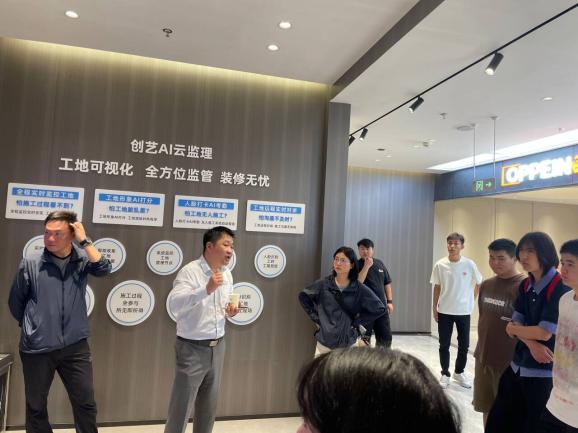 师生一行首先参观了创艺装饰的实景家居体验馆。该馆占地35000平方米,是目前西南地区规模最大、品类最全的家居展示中心。企业负责人详细介绍了集成装修模式,涵盖设计、施工、建材、家具、软装等全产业链服务,重点讲解了创艺装饰独创的一站式整装服务模式,以及如何通过标准化流程为客户提供更高效、优质的装修体验。