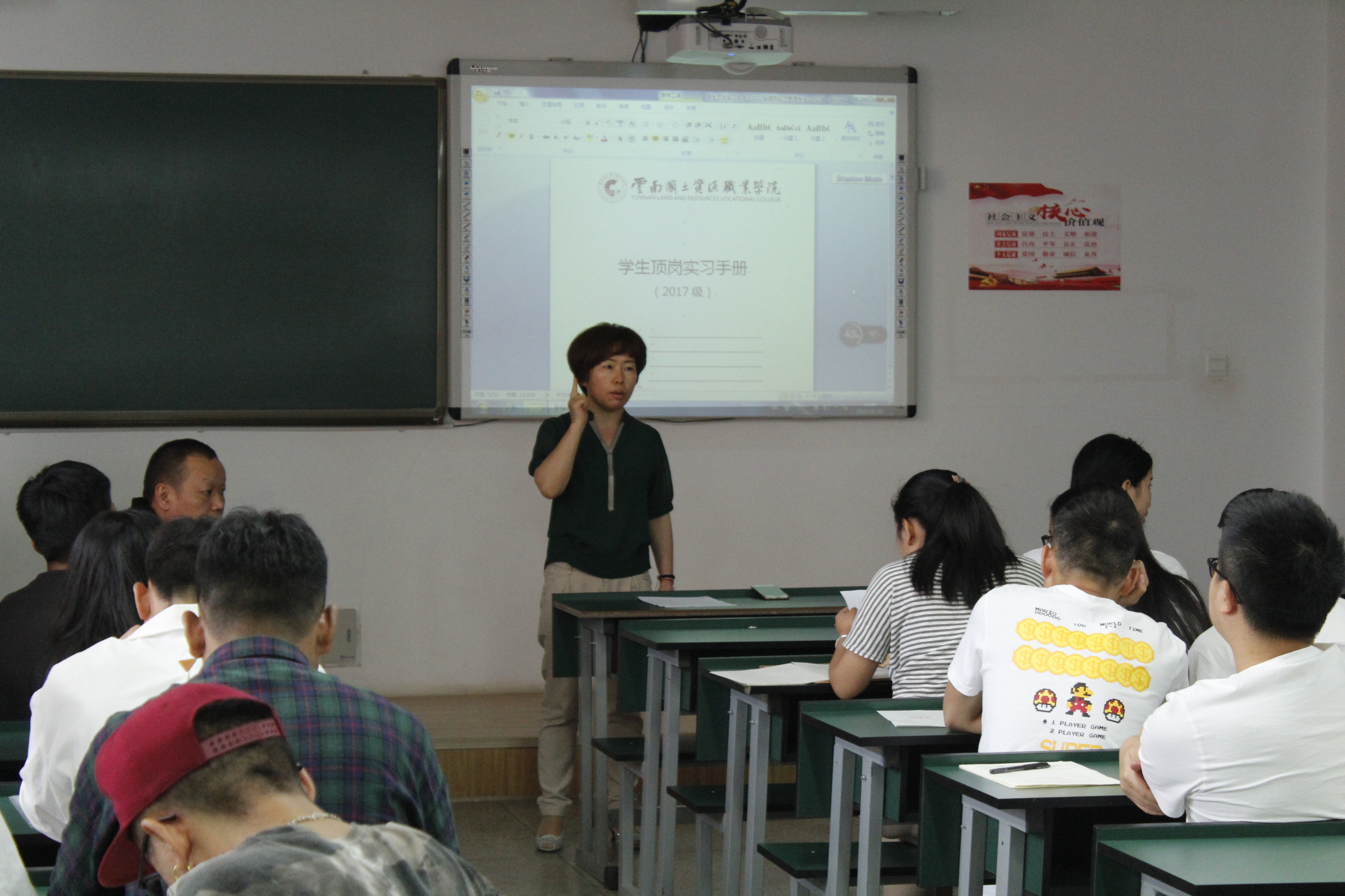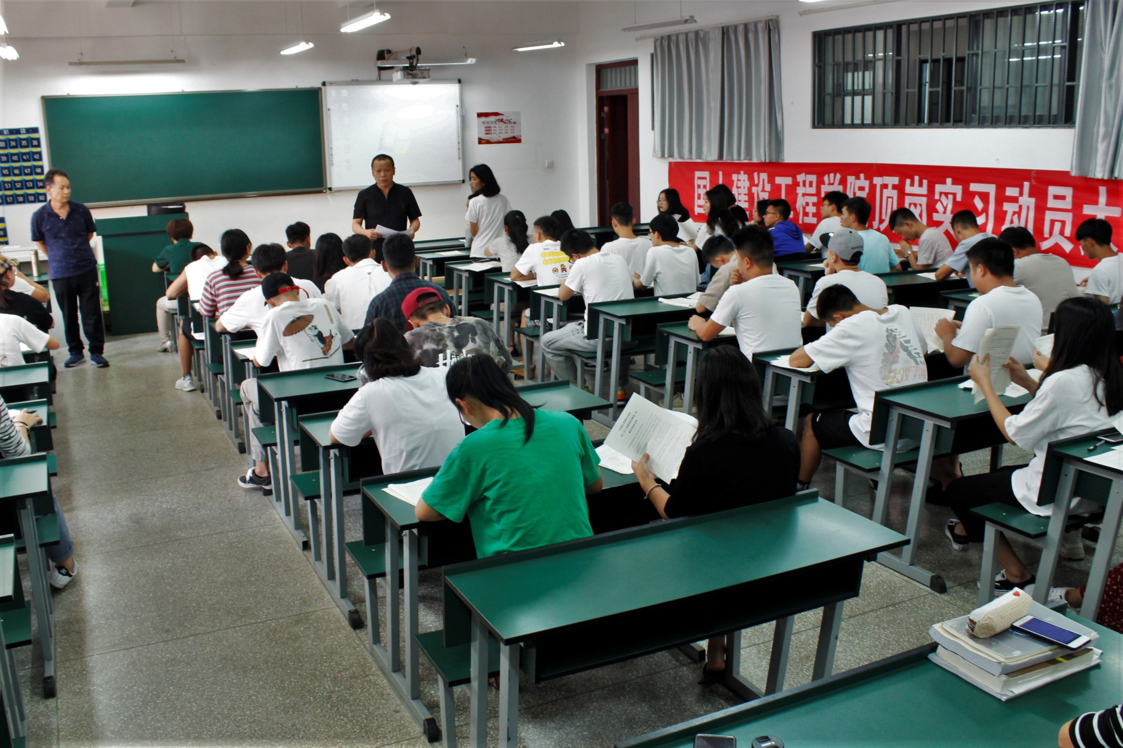 首先,彭老师对全部同学进行到场确认,并重点指出入党积极分子、学生会干部、班委要起到模范带头作用;紧接着,朱老师为同学们讲解此次实习的注意事项,主要包括蘑菇钉使用办法、周记记录、签到定位的要求、签订顶岗实习相关协议等内容进行了全面的解释,确保每位同学正常有序地完成此次顶岗实习。
