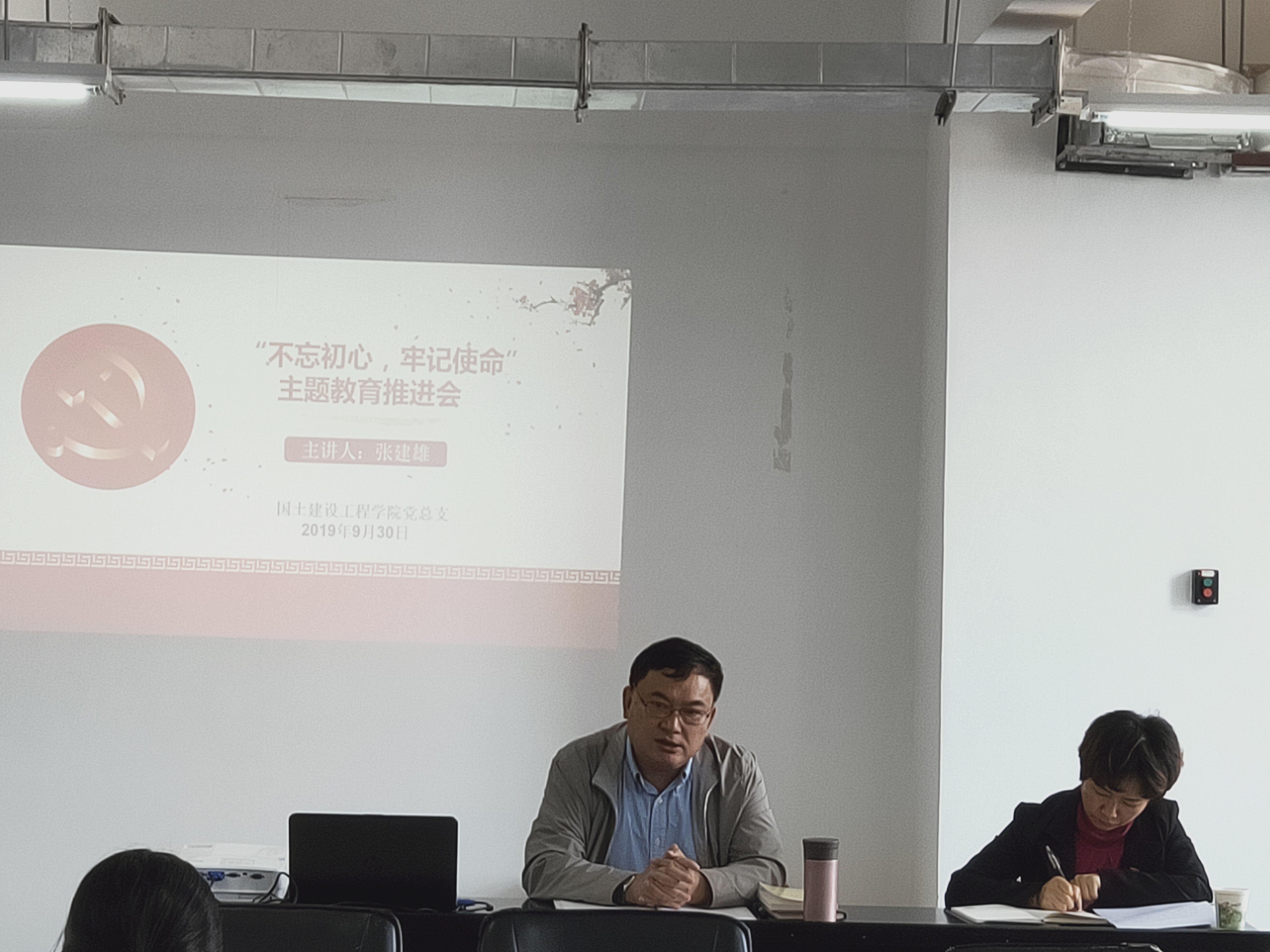 9月30日中午1点,国土澳门十大网投平台排行党总支在明尚楼C301开展“不忘初心、 牢记使命”主题教育推进会,会议由张建雄校长宣讲,党总支书记高昆主持,总支全体35名党员共同参会。