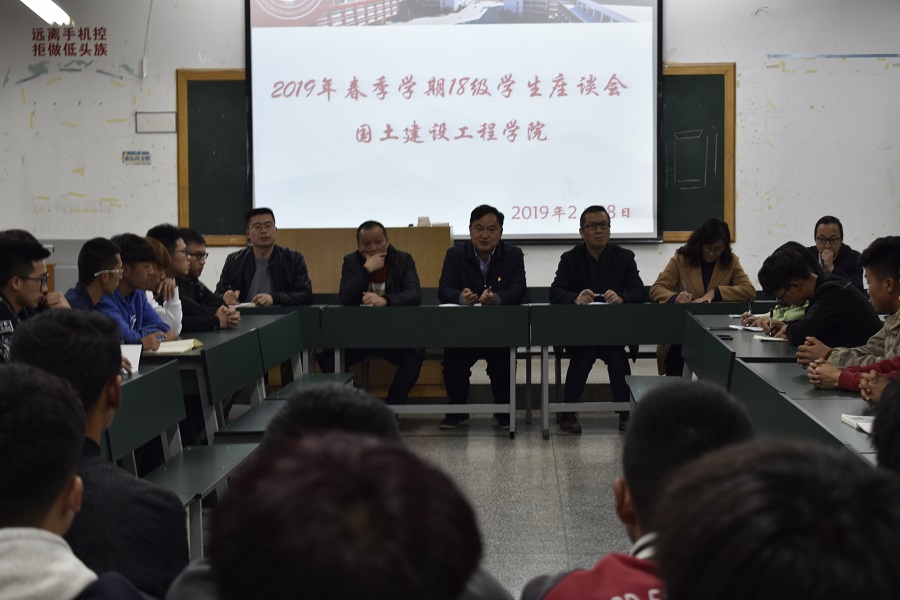 为进一步了解学生的学习、生活和思想动态,搭建学校、学院与学生沟通的桥梁,国土澳门十大网投平台排行于2月28日在经开校区101教室召开2019年春季学期18级学生座谈会。澳门十大网投平台排行校长张建雄教授带队参加座谈会,一起参加座谈会的还有副校长寸建平老师、经开区管委会常务副主任李翠珍老师、后勤服务中心主任刘艳老师、学生与安全处处长李广涛老师、教务处副处长任友理老师、国土澳门十大网投平台排行院长彭明兴老师。座谈会由国土澳门十大网投平台排行党总支书记高昆老师主持。