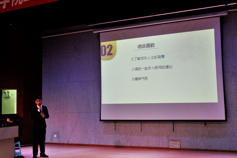 大赛伊始,主持人介绍了本次的比赛规则:比赛分为三个环节,满分100分,其中“生涯人物访谈报告”占35分,“ 现场展示及演讲”占45分,“现场问答”占20分,接下来由罗启钟老师为本次大赛致词,他表示访谈大赛是同学们了解职业需求,并帮助同学们正确认识自身条件,制定在大学期间合理而适合自己的计划。最后,希望各位同学在比赛中取得优异成绩。