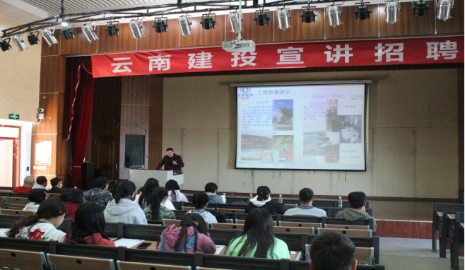 宣讲人从公司的历史发展开始为求职者们一一介绍。首先从云南建投公司五十多年来的历史开始依次走进,从云南区域内的各大隧道、建筑、矿业、装配工程到省外的各大矿业工程及其多项荣誉等,其雄厚的实力足以为建工学子们的一展风姿提供一个足够广阔的舞台,宣讲的最后宣讲人从精神、价值观、发展战略三方面展示出矿业公司的企业文化。其中“四海为家、艰苦奋斗、改革创新、铸造一流”的精神文化对于求职者们不为是一种要求,也不免为是一个挑战。