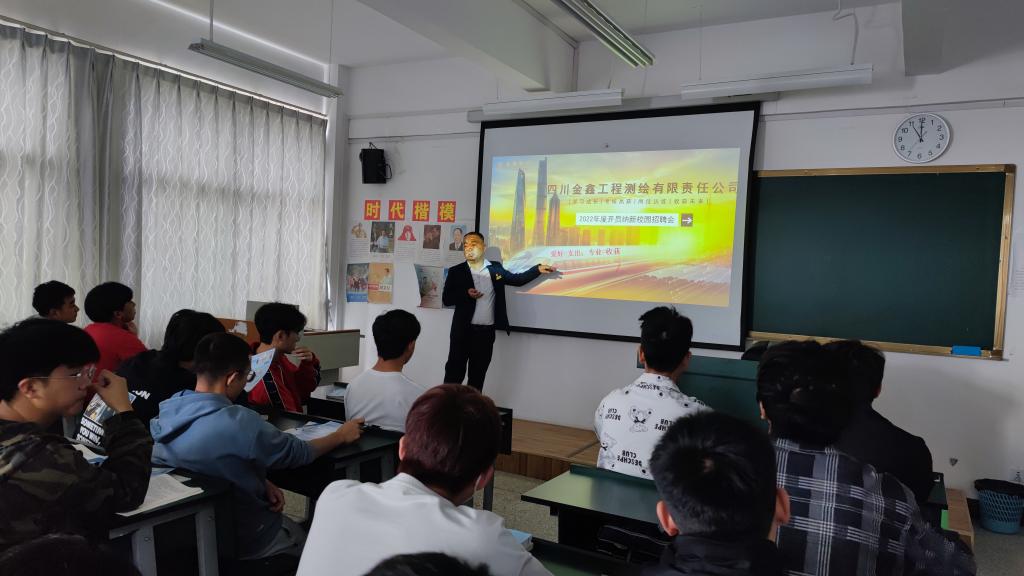 5月25日上午,澳门十大网投平台排行在明尚楼C406教室开展了优质企业进校园宣讲招聘活动。本次宣讲会邀请了四川金鑫工程测绘有限责任公司进行现场宣讲招聘,20级地下与隧道技术专业和20级工程造价专业的同学参加了此次宣讲招聘会。